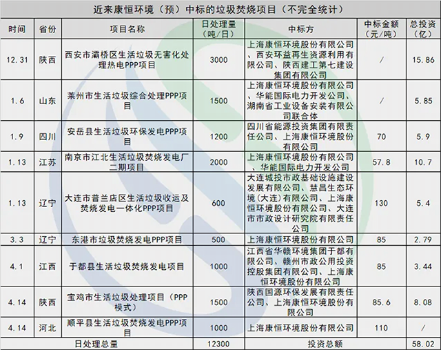 中國(guó)固廢網(wǎng)曾不完全統(tǒng)計(jì)發(fā)現(xiàn),從2019年年末至4月初的3個(gè)月內(nèi),康恒環(huán)境步履不停,已在6省7市拿下了7個(gè)垃圾焚燒項(xiàng)目,項(xiàng)目投資總額近50億。昨日,預(yù)中標(biāo)了寶雞8億生活垃圾處理PPP項(xiàng)目與順平縣生活垃圾焚燒發(fā)電PPP項(xiàng)目(未在公開(kāi)資料中查找到投資金額,暫且忽略不計(jì))的康恒環(huán)境,近來(lái)入手垃圾焚燒項(xiàng)目總額已逾58億。