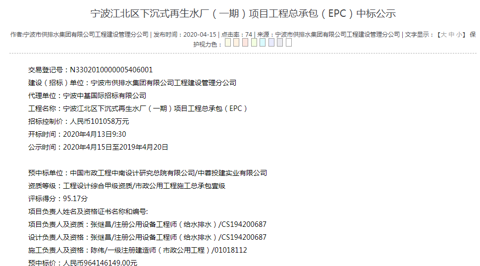 近日,中國市政工程中南設(shè)計(jì)研究總院有限公司/中蓉投建實(shí)業(yè)有限公司預(yù)中標(biāo)寧波江北區(qū)下沉式再生水廠(一期)項(xiàng)目工程總承包(EPC),預(yù)中標(biāo)金額為964146149.00元。