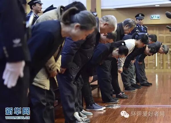 11月9日,天津中濱海盛衛(wèi)生安全評(píng)價(jià)監(jiān)測(cè)有限公司11名直接責(zé)任人員在法庭上鞠躬謝罪。新華社記者 岳月偉 攝