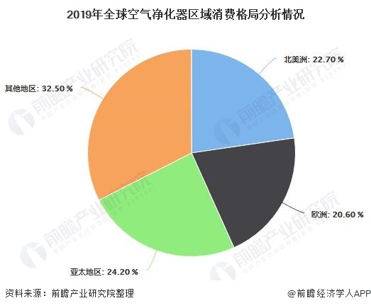 從全球空氣凈化器區(qū)域消費(fèi)格局來(lái)看,2019年北美和歐洲的市場(chǎng)份額占比較大,分別為22.70%和20.60%,亞太地區(qū)市場(chǎng)份額占比為24.20%,已經(jīng)超過(guò)北美洲和歐洲,其他區(qū)域占比之和為32.50%。
