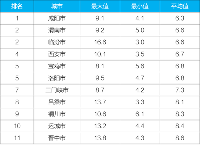 3月,汾渭平原11城市降塵量均值范圍在6.3–8.6噸/月·平方公里之間,平均為7.3噸/月·平方公里。汾渭平原11個(gè)城市降塵量平均值均小于9.0噸/月·平方公里。臨汾等9個(gè)城市降塵量最大值大于9.0噸/月·平方公里。汾渭平原11城市3月降塵監(jiān)測結(jié)果詳見附表2。