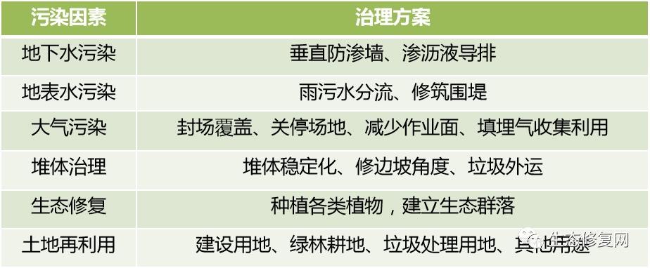 ? 三大任務(wù):污染控制、封場整治、生態(tài)修復? 可根據(jù)污染現(xiàn)狀、環(huán)境容量、投資、陳垃圾治理方式等制定治理方案