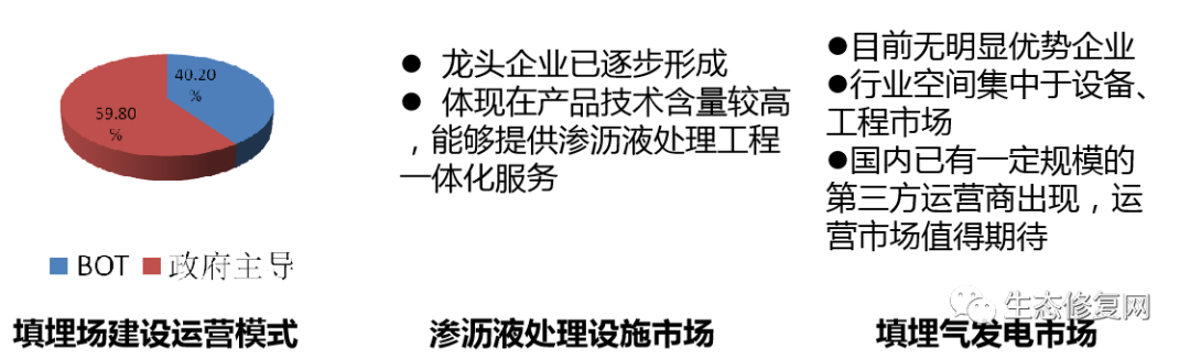 ? 填埋處理設(shè)施投資建設(shè)運營由政府主導逐步轉(zhuǎn)向市場化? 初步形成三大市場:垃圾填埋場建設(shè)與運營市場、垃圾填埋氣體利用市場、垃圾滲瀝液處理市場? 場地修復、生態(tài)景觀修復市場空間有待釋放