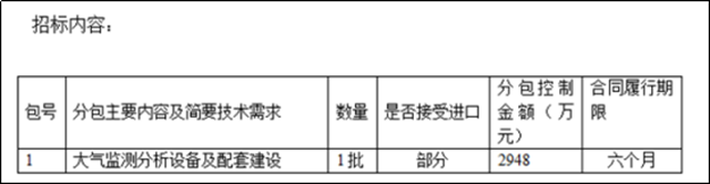 根據(jù)招標(biāo)公告可知,所需要的大氣監(jiān)測分析設(shè)備等部分可接受進(jìn)口,合同履行期限為6個月。另外,該項(xiàng)目不接受聯(lián)合體投標(biāo)。