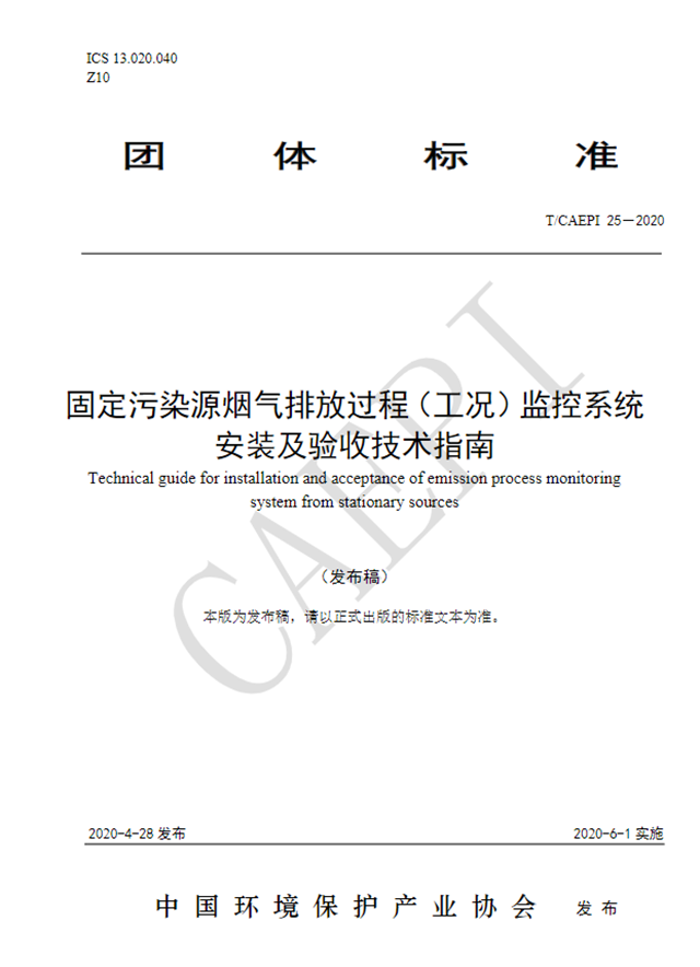 原標題:關(guān)于發(fā)布《固定污染源煙氣排放過程(工況)監(jiān)控系統(tǒng)安裝及驗收技術(shù)指南》(T/CAEPI-25-2020)的公告