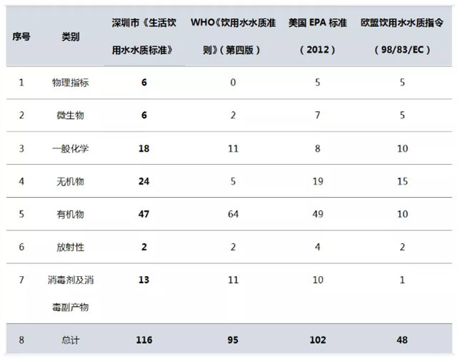 該標(biāo)準(zhǔn)對標(biāo)世界衛(wèi)生組織(WHO)、歐盟、美國、日本等先進(jìn)飲用水水質(zhì)標(biāo)準(zhǔn),結(jié)合深圳市水質(zhì)特點,提出了適應(yīng)深圳市的供水水質(zhì)指標(biāo)和限值,并對水質(zhì)管控提出要求,標(biāo)準(zhǔn)包含水質(zhì)指標(biāo)116項,其中常規(guī)指標(biāo)52項,非常規(guī)指標(biāo)64項。