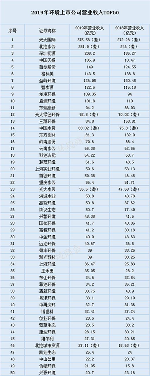 2019年,109家上市公司中84家企業(yè)實現(xiàn)營收增長,占比近八成,這一比例較2018年上升6%。營收超百億的企業(yè)11家,光大國際(375.58億港元)、北控水務(281.9億港元)、深圳能源(208.2億元)、中國天楹(185.9億元)、首創(chuàng)股份(149億元)位列前五。其中,前三甲營收超200億,光大國際則首破300億大關,同比增速37.94%。此外,大氣龍頭企業(yè)龍凈環(huán)保首次登上百億營收榜。