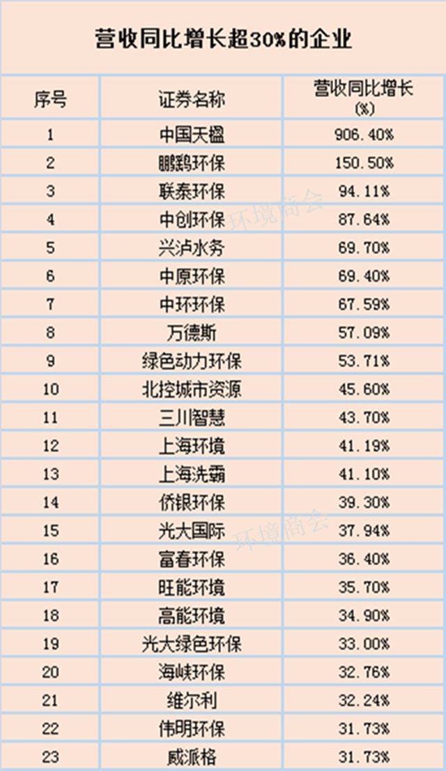 從營收增速來看,2019年,上市公司平均增速為22%,較2018年上升8%。營收增速30%以上的企業(yè)23家,與2018年基本持平,中國天楹、鵬鷂環(huán)保、興瀘水務、中環(huán)環(huán)保、高能環(huán)境、維爾利、萬德斯、威派格等都在高增長之列。其中,中國天楹實現(xiàn)營收186億,同比增長906%,位居營收增速榜首,這與其斥巨資吞下江蘇德展,打開海外市場有關。