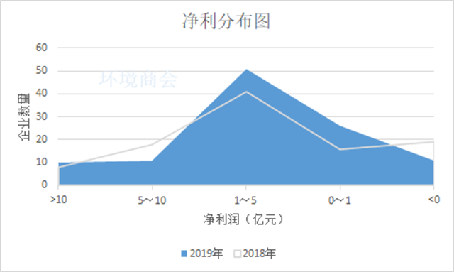 從凈利分布來看。2019年,10家企業(yè)凈利超10億,盈利水平在5億到10億之間的企業(yè)11家,這一數(shù)字較2018年減少7家。此外,近半數(shù)企業(yè)的歸母凈利集中在1億~5億之間,而盈利水平在1億以下的企業(yè)有26家,這兩部分企業(yè)數(shù)據(jù)合計達77家,較2018年增加了20家。虧損企業(yè)數(shù)量則相對減少,為11家,包括津膜科技、鐵漢生態(tài)、天翔環(huán)境、凱迪生態(tài)、盛運環(huán)保、中創(chuàng)環(huán)保等,這些企業(yè)除鐵漢生態(tài)、津膜科技外基本在2018年已經陷入虧損狀態(tài),至今尚未扭轉,虧損最為嚴重的是盛運環(huán)保,虧損額度達20億。