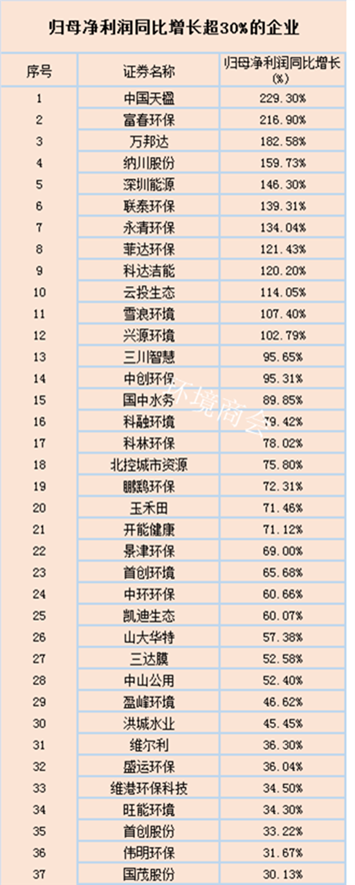 2019年產業(yè)整體盈利好轉從歸母凈利潤的增長速度也可看出一二。109家企業(yè)的歸母凈利潤平均增速比2018年有大幅提高,增速在30%以上的企業(yè)達37家,占比約35%,增幅高于50%的企業(yè)有28家,其中中國天楹、富春環(huán)保、萬邦達、科達潔能、永清環(huán)保、雪浪環(huán)境等12家企業(yè)盈利翻番。此外,IPO新貴景津環(huán)保(69%)、玉禾田(71.46%)、國貿股份(30.13%)、僑銀環(huán)保(27.94%)等盈利也有很好的表現(xiàn)。