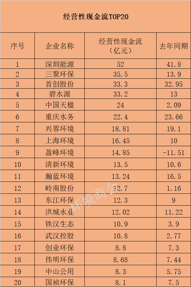 一是具有穩(wěn)定收益的地方國資現(xiàn)金流狀況良好。在經營性現(xiàn)金流排行的前20名中,首創(chuàng)股份、重慶水務、興蓉環(huán)境、上海環(huán)境、瀚藍環(huán)境、洪城水業(yè)、中山公用等企業(yè)表現(xiàn)出一個共同的特征--現(xiàn)金流穩(wěn)定且相對充裕。這些企業(yè)大部分都又很明顯的屬地特征,從地方成長起來,手握大量能提供穩(wěn)定現(xiàn)金流的水務或固廢等項目,與此同時,在上一輪PPP激戰(zhàn)中它們多數(shù)參與不深或并未參與,因此,在這輪危機中現(xiàn)金流受影響明顯小很多,抗沖擊能力強勁。