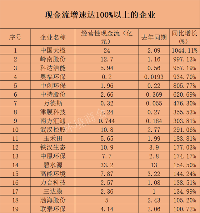 從增長幅度來看,有63家企業(yè)現(xiàn)金流正增長,占比超七成,另有23家下降。在2018年、2019年經營性現(xiàn)金流均為正流入的企業(yè)中,增長幅度超50%的企業(yè)有28家,其中中國天楹(1044.11%)、嶺南股份(997.13%)、科達潔能(957.19%)、奧福環(huán)保(934.70%)、中創(chuàng)環(huán)保(805.77%)、中持股份(620.69%)等增長頗為強勁。