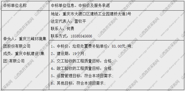 另據(jù)了解,項(xiàng)目投資規(guī)模69665萬元,合作期限30年。重慶三峰環(huán)境集團(tuán)股份有限公司為聯(lián)合體牽頭人。具體中標(biāo)信息如下: