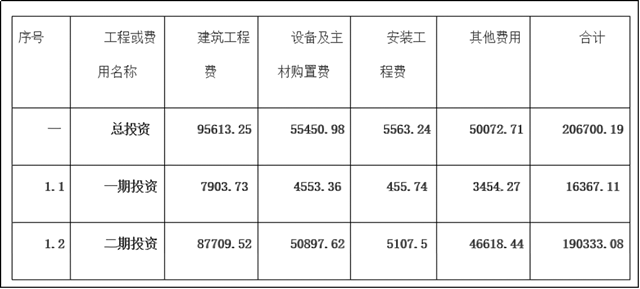 公告顯示,該項目建設(shè)投資總額為206700.19萬元,其中一期總投資16367.11萬元,二期總投資為190333.08萬元,具體如下表: