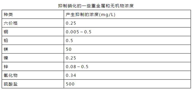 某些重金屬離子、絡(luò)合陰離子、氰化物以及一些有機(jī)物質(zhì)會干擾或破壞硝化細(xì)菌的正常生理活動。當(dāng)這些物質(zhì)在污水中的濃度較高,便會抑制生物硝化的正常運(yùn)行。例如,當(dāng)鉛離子大于0.5mg/L、酚大于5.6mg/L、硫脲大于0.076mg/L時(shí),硝化均會受到抑制。有趣的是,當(dāng)NH3-N濃度大于200mg/L時(shí),也會對硝化過程產(chǎn)生抑制,但城市污水中一般不會有如此高的NH3-N濃度。