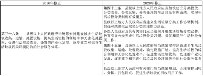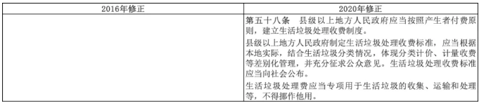首提生活垃圾收費(fèi)要求。這一條文與國(guó)家發(fā)展改革委關(guān)于創(chuàng)新和完善促進(jìn)綠色發(fā)展價(jià)格機(jī)制的意見(jiàn)中關(guān)于生活垃圾處理費(fèi)的指導(dǎo)思想高度一致(參考鏈接:透視發(fā)改943文:垃圾收費(fèi)、分類(lèi)雙管齊下,固廢管理進(jìn)入體系化)。E20研究院固廢產(chǎn)業(yè)研究中心負(fù)責(zé)人潘功博士認(rèn)為,對(duì)生活垃圾的計(jì)量收費(fèi)和差別化收費(fèi),融入了生活垃圾分類(lèi)理念,明確了“污染者付費(fèi)”原則,是推動(dòng)生活垃圾分類(lèi)的有效手段、有力手段、強(qiáng)制手段。全面垃圾收費(fèi)的號(hào)角,伴隨強(qiáng)制垃圾分類(lèi)的“再擴(kuò)容”和固廢法修訂的再次強(qiáng)調(diào)而正式吹響,通過(guò)全面建立覆蓋成本并合理盈利的固體廢物處理收費(fèi)機(jī)制,加快建立有利于促進(jìn)垃圾分類(lèi)和減量化、資源化、無(wú)害化處理的激勵(lì)約束機(jī)制,將成為垃圾分類(lèi)工作的一個(gè)重要突破口。