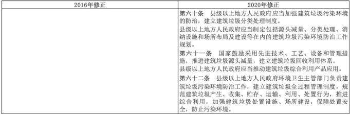 明確建筑垃圾分類(lèi)及消納要求。新版固廢法對(duì)建筑垃圾的處理提出了明確要求,對(duì)縣級(jí)以上人民政府的治理和規(guī)劃責(zé)任加以明確,并要求工程施工單位對(duì)所產(chǎn)生的建筑垃圾提供資源化消納預(yù)案,對(duì)過(guò)去相對(duì)散亂的建筑垃圾問(wèn)題進(jìn)行了重點(diǎn)關(guān)注。商業(yè)模式上來(lái)看建筑垃圾資源化項(xiàng)目運(yùn)營(yíng)性較強(qiáng),且有使用者付費(fèi)基礎(chǔ),有完全商業(yè)化的可能。(推薦閱讀:餐廚280元/噸建筑30元/噸,光大國(guó)際斬獲泗陽(yáng)固廢項(xiàng)目)。但來(lái)料和資源化產(chǎn)品的雙向需求風(fēng)險(xiǎn)均不穩(wěn)定,使得建筑垃圾資源化項(xiàng)目商業(yè)模式尚不完善,市場(chǎng)空間的釋放相對(duì)較為緩慢。相信在“無(wú)廢城市”,及此次固廢法修訂的刺激下將迎來(lái)新勢(shì)能。建筑垃圾資源化有望成為固廢領(lǐng)域下一個(gè)垃圾焚燒。