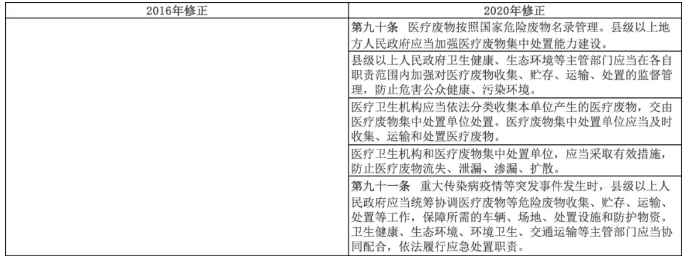 醫(yī)廢管理方面的調(diào)整主要包括:一是,明確醫(yī)療廢物按照國(guó)家危險(xiǎn)廢物名錄管理。縣級(jí)以上地方人民政府應(yīng)當(dāng)加強(qiáng)醫(yī)療廢物集中處置能力建設(shè)。二是,明確監(jiān)管職責(zé)。縣級(jí)以上人民政府衛(wèi)生健康、生態(tài)環(huán)境等主管部門(mén)應(yīng)當(dāng)在各自職責(zé)范圍內(nèi)加強(qiáng)對(duì)醫(yī)療廢物收集、貯存、運(yùn)輸、處置的監(jiān)督管理,防止危害公眾健康、污染環(huán)境。三是,突出主體責(zé)任。醫(yī)療衛(wèi)生機(jī)構(gòu)應(yīng)當(dāng)依法分類(lèi)收集本單位產(chǎn)生的醫(yī)療廢物,交由醫(yī)療廢物集中處置單位處置。醫(yī)療廢物集中處置單位應(yīng)當(dāng)及時(shí)收集、運(yùn)輸和處置醫(yī)療廢物。醫(yī)療衛(wèi)生機(jī)構(gòu)和醫(yī)療廢物集中處置單位應(yīng)當(dāng)采取有效措施,防止醫(yī)療廢物流失、泄漏、滲漏、擴(kuò)散。四是,完善應(yīng)急保障機(jī)制。重大傳染病疫情等突發(fā)事件發(fā)生時(shí),縣級(jí)以上人民政府應(yīng)當(dāng)統(tǒng)籌協(xié)調(diào)醫(yī)療廢物等危險(xiǎn)廢物收集、貯存、運(yùn)輸、處置等工作,保障所需的車(chē)輛、場(chǎng)地、處置設(shè)施和防護(hù)物資。有關(guān)主管部門(mén)應(yīng)當(dāng)協(xié)同配合,依法履行應(yīng)急處置職責(zé)。五是,要求各級(jí)人民政府按照事權(quán)劃分的原則安排必要的資金用于重大傳染病疫情等突發(fā)事件產(chǎn)生的醫(yī)療廢物等危險(xiǎn)廢物應(yīng)急處置。
