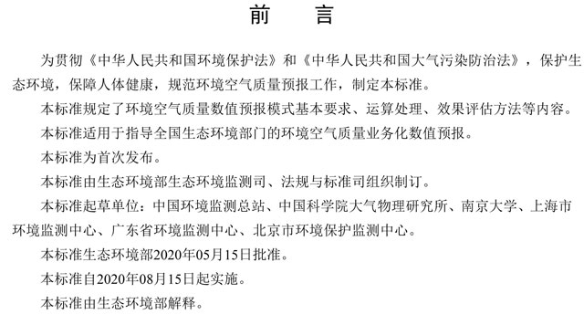 為貫徹《中華人民共和國(guó)環(huán)境保護(hù)法》和《中華人民共和國(guó)大氣污染防治法》,保護(hù)生態(tài)環(huán)境,保障人體健康,規(guī)范環(huán)境空氣質(zhì)量預(yù)報(bào)工作,制定本標(biāo)準(zhǔn)。本標(biāo)準(zhǔn)規(guī)定了環(huán)境空氣質(zhì)量數(shù)值預(yù)報(bào)模式基本要求、運(yùn)算處理、效果評(píng)估方法等內(nèi)容。本標(biāo)準(zhǔn)適用于指導(dǎo)全國(guó)生態(tài)環(huán)境部門的環(huán)境空氣質(zhì)量業(yè)務(wù)化數(shù)值預(yù)報(bào)。本標(biāo)準(zhǔn)為首次發(fā)布。