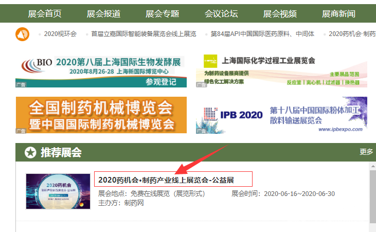 通道一:進(jìn)入制藥網(wǎng)http://www.zyzhan.com/,點(diǎn)開(kāi)導(dǎo)航欄的“展會(huì)”欄目,進(jìn)入“2020藥機(jī)會(huì)·制藥產(chǎn)業(yè)線上展覽會(huì)-公益展”;