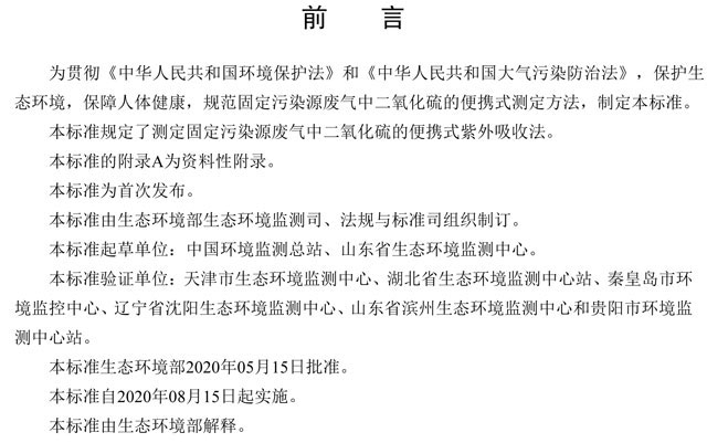 為貫徹《中華人民共和國(guó)環(huán)境保護(hù)法》和《中華人民共和國(guó)大氣污染防治法》,保護(hù)生態(tài)環(huán)境,保障人體健康,規(guī)范固定污染源廢氣中二氧化硫的便攜式測(cè)定方法,制定本標(biāo)準(zhǔn)。本標(biāo)準(zhǔn)規(guī)定了測(cè)定固定污染源廢氣中二氧化硫的便攜式紫外吸收法。本標(biāo)準(zhǔn)的附錄A為資料性附錄。本標(biāo)準(zhǔn)為首次發(fā)布。