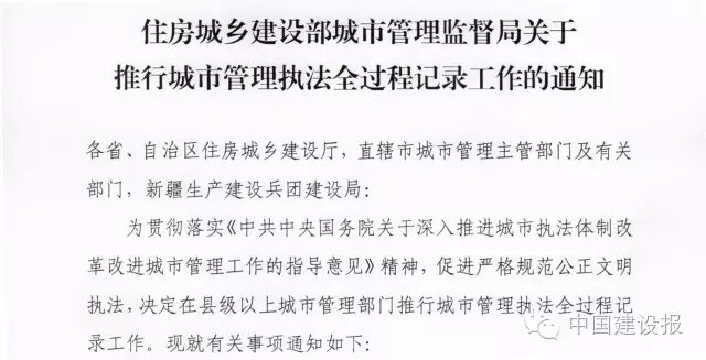各省、自治區(qū)住房城鄉(xiāng)建設(shè)廳,直轄市城市管理主管部門及有關(guān)部門,新疆生產(chǎn)建設(shè)兵團(tuán)建設(shè)局:為貫徹落實(shí)《中共中央國務(wù)院關(guān)于深入推進(jìn)城市執(zhí)法體制改革改進(jìn)城市管理工作的指導(dǎo)意見》精神,促進(jìn)嚴(yán)格規(guī)范公正文明執(zhí)法,決定在縣級以上城市管理部門推行城市管理執(zhí)法全過程記錄工作?,F(xiàn)就有關(guān)事項(xiàng)通知如下:各地城市管理部門要通過文字、音像等記錄方式,對執(zhí)法活動(dòng)全過程進(jìn)行記錄,客觀、公正、完整地記錄執(zhí)法工作情況和相關(guān)證據(jù),實(shí)現(xiàn)全過程留痕和可回溯管理。規(guī)范執(zhí)法文書的制作和使用,確保執(zhí)法文書和案卷完整準(zhǔn)確、合法規(guī)范。合理配備并使用執(zhí)法記錄儀等現(xiàn)場執(zhí)法記錄設(shè)備和視音頻資料傳輸、存儲(chǔ)、等設(shè)備。對現(xiàn)場執(zhí)法活動(dòng)中容易引發(fā)爭議和糾紛的,應(yīng)當(dāng)實(shí)行全過程音像記錄。積極利用大數(shù)據(jù)、云計(jì)算、物聯(lián)網(wǎng)等信息技術(shù),結(jié)合數(shù)字化城市管理平臺(tái)建設(shè)和辦公自動(dòng)化系統(tǒng)建設(shè)等,探索成本低、效果好、易保存、不能刪改的音像記錄方式,提高執(zhí)法記錄的信息化水平。做好執(zhí)法文書和視音頻資料的管理和存儲(chǔ),逐步實(shí)現(xiàn)與數(shù)字化城市管理信息系統(tǒng)關(guān)聯(lián)共享。建立健全執(zhí)法全過程記錄保存、管理、使用等工作制度。定期組織對執(zhí)法文書和視音頻資料進(jìn)行抽查檢查。充分發(fā)揮全過程記錄信息在案卷評查、數(shù)據(jù)統(tǒng)計(jì)分析、執(zhí)法監(jiān)督等工作中的作用。各地要充分認(rèn)識(shí)推行城市管理執(zhí)法全過程記錄工作的重要意義,切實(shí)落實(shí)工作要求,配備相關(guān)儀器設(shè)備,嚴(yán)格規(guī)范記錄行為,妥善保管使用記錄信息,確保執(zhí)法全過程記錄工作有效推行。住房城鄉(xiāng)建設(shè)部城市管理監(jiān)督局