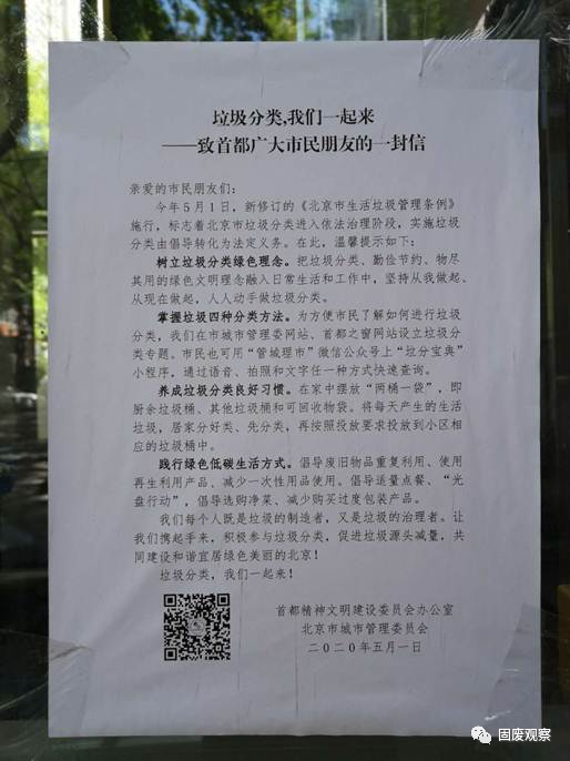 垃圾分類(lèi)的宣傳和指導(dǎo)如何進(jìn)一步加強(qiáng)?藍(lán)藍(lán)天工作室記者觀(guān)察自己所在的小區(qū)發(fā)現(xiàn),設(shè)了分類(lèi)垃圾桶,旁邊沒(méi)有專(zhuān)業(yè)指導(dǎo)人員,居民分不分類(lèi)、分得對(duì)不對(duì),基本全憑自覺(jué)。上海市剛推行垃圾分類(lèi)的時(shí)候,經(jīng)常有志愿者站在垃圾桶旁問(wèn)前來(lái)投放的居民“你是什么垃圾”。為啥北京很多小區(qū)目前沒(méi)人問(wèn)這樣的問(wèn)題?國(guó)務(wù)院發(fā)展研究中心資源與環(huán)境政策研究所副所長(zhǎng)常紀(jì)文表示,從5月1日《條例》開(kāi)始執(zhí)行后,他天天去附近小區(qū)拍照檢查??傮w看來(lái)垃圾分類(lèi)已經(jīng)起步了,各小區(qū)基本都配備了廚余垃圾桶等,但仍然存在一些問(wèn)題。例如,部分小區(qū)內(nèi)沒(méi)有宣傳橫幅,分類(lèi)垃圾桶邊沒(méi)有配備專(zhuān)人進(jìn)行指導(dǎo)監(jiān)督。一些小區(qū)宣傳和指導(dǎo)不到位,導(dǎo)致居民有分類(lèi)意識(shí),但缺乏分類(lèi)知識(shí)。“我在不少小區(qū)看到大家把外賣(mài)餐盒跟廚余垃圾扔在一起,但它屬于使用過(guò)的、沾了菜湯油污的塑料類(lèi)制品,應(yīng)該投放到其他垃圾桶中?!背<o(jì)文說(shuō)。在有的小區(qū),為保證每個(gè)分類(lèi)垃圾桶旁都有指導(dǎo)人員,取消了一些垃圾桶,讓居民走到較遠(yuǎn)的投放點(diǎn)扔垃圾。常紀(jì)文表示,他觀(guān)察到一些小區(qū)內(nèi)垃圾桶分布不均勻,有些樓棟下缺少?gòu)N余垃圾桶,有些沒(méi)有其他垃圾桶,“至少應(yīng)該以某種形式讓居民知曉,小區(qū)內(nèi)哪里有對(duì)應(yīng)的分類(lèi)垃圾桶,方便精準(zhǔn)投放?!?/span>劉建國(guó)認(rèn)為,現(xiàn)階段,應(yīng)進(jìn)一步加大宣傳教育和組織動(dòng)員力度,讓垃圾分類(lèi)真正“熱起來(lái)”;層層落實(shí)各級(jí)政府相關(guān)職能部門(mén)職責(zé),特別是切實(shí)落實(shí)管理責(zé)任人責(zé)任,將壓力和責(zé)任傳導(dǎo)到每個(gè)居民,讓垃圾分類(lèi)“硬起來(lái)”;統(tǒng)籌疫情防控和垃圾分類(lèi)兩項(xiàng)工作,讓二者有機(jī)結(jié)合,互相促進(jìn),讓垃圾分類(lèi)“動(dòng)起來(lái)”;北京的黨政機(jī)關(guān)、高??蒲性核⑵髽I(yè)總部、社會(huì)組織密集,應(yīng)帶頭做好源頭減量和垃圾分類(lèi),為居民作出表率、增添信心,讓垃圾分類(lèi)“亮起來(lái)”。“未來(lái),要從執(zhí)法保障、政策激勵(lì)、長(zhǎng)效機(jī)制、科學(xué)管理、多元共治、科技支撐等不同層面,不斷完善和優(yōu)化垃圾分類(lèi)投放、收集、運(yùn)輸、處理全鏈條,倒逼生產(chǎn)生活環(huán)節(jié)源頭減量,分類(lèi)物品物盡其用各得其所,降低垃圾分類(lèi)的綜合社會(huì)成本,促進(jìn)居民養(yǎng)成良好習(xí)慣,提升社會(huì)文明水平?!眲⒔▏?guó)說(shuō)。上圖:北京市有關(guān)部門(mén)致市民的一封信。(劉毅攝) 如何避免運(yùn)輸和處置中出現(xiàn)混裝混運(yùn)現(xiàn)象?不少居民表示,推行生活垃圾強(qiáng)制分類(lèi)以來(lái),自己所在的小區(qū),垃圾分類(lèi)的宣傳力度明顯加強(qiáng),做到了分類(lèi)投放、分類(lèi)運(yùn)輸。然而,也有居民表示,自己辛辛苦苦分好類(lèi),甚至把快遞盒上的膠帶都刮下來(lái)按類(lèi)別投放,結(jié)果發(fā)現(xiàn)垃圾車(chē)還是把所有垃圾一股腦混倒在一起運(yùn)走。劉建國(guó)表示,“前端分類(lèi),后端混合”是個(gè)廣受詬病的老問(wèn)題,實(shí)際上是垃圾分類(lèi)系統(tǒng)前后端不配套造成的?!侗本┦猩罾芾?xiàng)l例》中約束的一個(gè)主要對(duì)象,是從事垃圾收集運(yùn)輸處理的企業(yè),處罰門(mén)檻很低,處罰力度很大,就是為了解決先分后混、混裝混運(yùn)的問(wèn)題。“居民看到混裝混運(yùn)現(xiàn)象,可以馬上投訴,督促企業(yè)做好分類(lèi)收集運(yùn)輸處理。當(dāng)然,咱們自己也要做好分類(lèi)投放,不能以混裝混運(yùn)為借口而不履行義務(wù)。只有大家各負(fù)其責(zé),才能徹底杜絕混裝混運(yùn)現(xiàn)象?!眲⒔▏?guó)說(shuō)。常紀(jì)文認(rèn)為,前端后端匹配才符合垃圾分類(lèi)的目的。對(duì)此需要標(biāo)本兼治:治本,需建設(shè)相匹配的廚余垃圾處置設(shè)施以及干垃圾的焚燒或填埋設(shè)施。治標(biāo),應(yīng)采取嚴(yán)格的處罰措施,沒(méi)有處罰,小區(qū)物業(yè)和環(huán)衛(wèi)部門(mén)往往會(huì)存有僥幸心理,使垃圾分類(lèi)工作停滯不前;只有嚴(yán)格執(zhí)行懲處措施,才能對(duì)垃圾分類(lèi)執(zhí)行方起到震懾作用,后端的各個(gè)環(huán)節(jié)才能順暢配合。為更好解決后端混運(yùn)問(wèn)題,常紀(jì)文還建議,改良垃圾運(yùn)輸車(chē)輛。“歐洲有許多垃圾分類(lèi)車(chē)輛是能同時(shí)運(yùn)輸兩種垃圾的,我們也可以在設(shè)計(jì)方面做些改動(dòng),在車(chē)輛內(nèi)部進(jìn)行分隔,讓一輛車(chē)既可以運(yùn)廚余垃圾也可以運(yùn)其他垃圾,降低成本的同時(shí),方便操作?!?/span>劉建國(guó)認(rèn)為,疫情防控與垃圾分類(lèi)這兩件事并不沖突?,F(xiàn)在疫情防控已經(jīng)進(jìn)入到常態(tài)化階段,可以把疫情防控中形成的好經(jīng)驗(yàn)好做法好機(jī)制,如社區(qū)精細(xì)化管理、居民的規(g