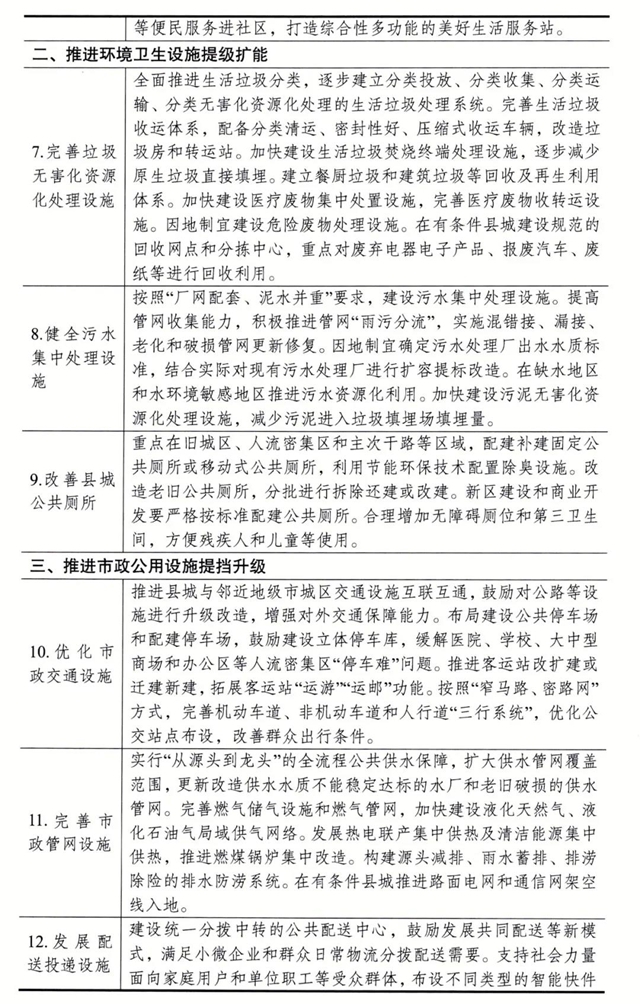 (二)明晰建設(shè)領(lǐng)域。各地區(qū)要瞄準(zhǔn)市場不能有效配置資源、需要政府支持引導(dǎo)的公共領(lǐng)域,聚力推進17項建設(shè)任務(wù)。圍繞公共服務(wù)設(shè)施提標(biāo)擴面,優(yōu)化醫(yī)療衛(wèi)生設(shè)施、教育設(shè)施、養(yǎng)老托育設(shè)施、文旅體育設(shè)施、社會福利設(shè)施和社區(qū)綜合服務(wù)設(shè)施。圍繞環(huán)境衛(wèi)生設(shè)施提級擴能,完善垃圾無害化資源化處理設(shè)施、污水集中處理設(shè)施和縣城公共廁所。圍繞市政公用設(shè)施提擋升級,推進市政交通設(shè)施、市政管網(wǎng)設(shè)施、配送投遞設(shè)施、老舊小區(qū)更新改造和縣城智慧化改造。圍繞產(chǎn)業(yè)培育設(shè)施提質(zhì)增效,完善產(chǎn)業(yè)平臺配套設(shè)施、冷鏈物流設(shè)施和農(nóng)貿(mào)市場。
