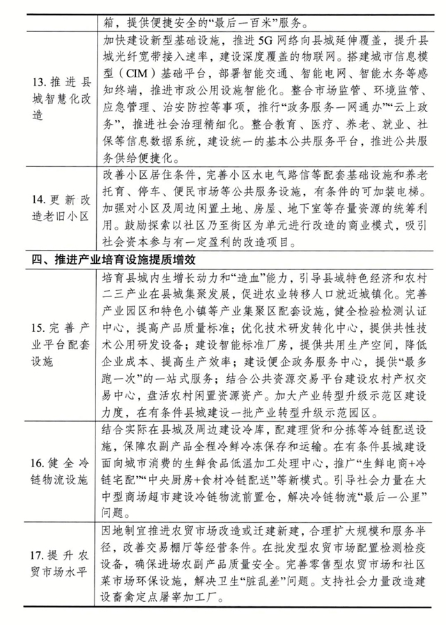 縣城是我國推進工業(yè)化城鎮(zhèn)化的重要空間、城鎮(zhèn)體系的重要一環(huán)、城鄉(xiāng)融合發(fā)展的關(guān)鍵紐帶。改革開放特別是黨的十八大以來,縣城建設(shè)日新月異,但新冠肺炎疫情暴露出縣城公共衛(wèi)生、人居環(huán)境、公共服務(wù)、市政設(shè)施、產(chǎn)業(yè)配套等方面仍存在不少短板弱項,綜合承載能力和治理能力仍然較弱,對經(jīng)濟發(fā)展和農(nóng)業(yè)轉(zhuǎn)移人口就近城鎮(zhèn)化的支撐作用不足,與滿足人民美好生活需要還有較大差距。為加快推進縣城城鎮(zhèn)化補短板強弱項工作,現(xiàn)通知如下: