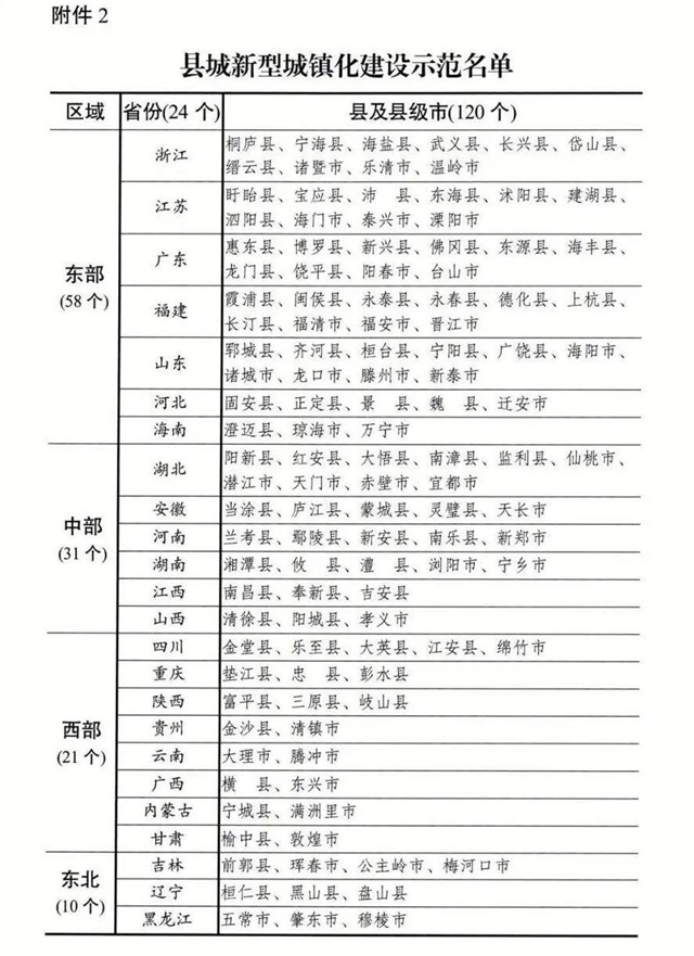 (十)強化示范帶動。以發(fā)展基礎(chǔ)扎實、財政實力較強、政府債務(wù)率較低為基本要求,在湖北、長江三角洲區(qū)域、粵港澳大灣區(qū)和其他東中部都市圈地區(qū),兼顧西部和東北地區(qū),選擇120個縣及縣級市開展縣城新型城鎮(zhèn)化建設(shè)示范工作(附件2)。切實加大中央財政性資金等政策支持力度,支持其圍繞縣城城鎮(zhèn)化補短板強弱項項目范疇,啟動建設(shè)示范性項目,創(chuàng)新資金投入方式與運營模式??偨Y(jié)提煉典型經(jīng)驗,以現(xiàn)場會、典型案例推介等方式加以推廣。