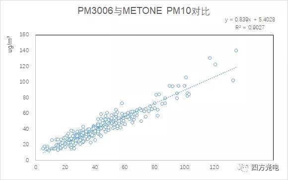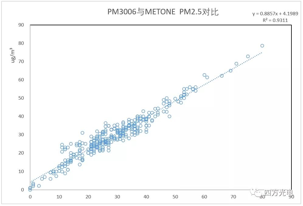 我國室外揚塵網格化監(jiān)測經歷了早期的β射線吸收法,到采用民用凈化器大量應用的激光粉塵傳感器的過程。在使用過程中發(fā)現,民用的激光粉塵傳感器不僅不能滿足-30——70℃室外環(huán)境溫度的全天候使用要求,同時還必須面對監(jiān)測場所,特別是建設工地經常噴灑降霾的水霧影響,或者下雨潮濕的氣候環(huán)境等。這種環(huán)境下,水霧經常被判斷為嚴重霧霾造成爆表。同時網格化室外粉塵監(jiān)控希望得到局部的可以與國家大氣環(huán)境監(jiān)測網數據具備的PM2.5/PM10/TSP的多項參數對比, 民用激光傳感器由于激光功率小,采樣流量小, PM10分辨率很低,無法提供準確的PM10, 通常采用根據PM2.5的數字進行比例計算,造成PM10監(jiān)測數據失真。四方光電研制的PM3003X、 PM3006激光揚塵傳感器通過采用寬溫型大功率線型激光光源、API粉塵自動識別技術、先進的流道設計實現抗污染、大流量車規(guī)級采樣機構、高濕度環(huán)境的水霧去除裝置等,低成本地實現了對室外揚塵粉塵與β射線吸收法達到0.9相關系數的高精度測量。