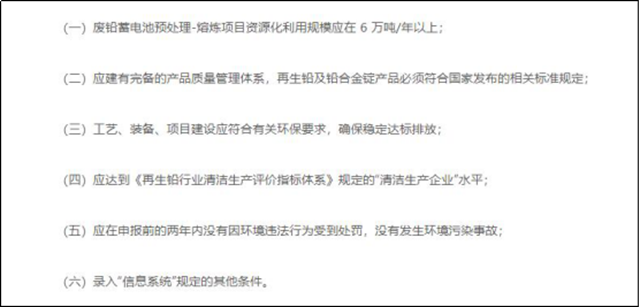 關(guān)于蓄電池的資源利用,《征求意見稿》提出了園區(qū)化管理和企業(yè)管理兩種。其中規(guī)定廢鉛蓄電池資源化利用項(xiàng)目應(yīng)位于功能定位相符、環(huán)保基礎(chǔ)設(shè)施齊全的產(chǎn)業(yè)園區(qū)內(nèi);各地市應(yīng)提出轄區(qū)內(nèi)符合條件的規(guī)范資源化利用企業(yè),經(jīng)行業(yè)評議、部委合議后錄入“信息系統(tǒng)”,具體條件如下: