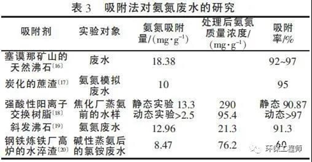 該法一般只適用于低濃度氨氮廢水, 而對于高濃度的氨氮廢水, 使用吸附法會因吸附劑更換頻繁而造成操作困難, 因此需要結(jié)合其他工藝來協(xié)同完成脫氮過程。供吸附法使用的吸附劑很多, 但不同吸附劑對廢水中氨氮的吸附量卻有很大不同, 表3 對比了部分吸附劑的吸附效果。