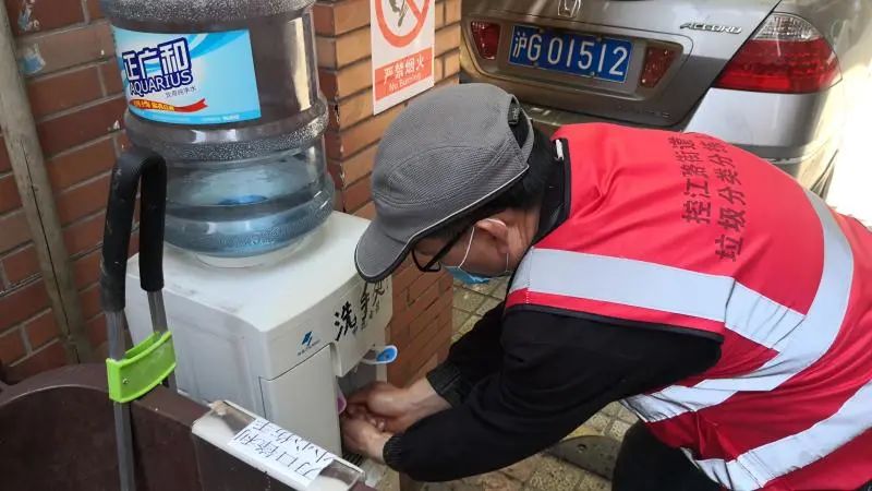 鳳六新苑垃圾投放點旁沒有條件裝洗手臺盆,小區(qū)物業(yè)經(jīng)理劉昌澄看了一眼閑置的飲水機(jī),“就你了!”居民破袋時如果臟了手,就翻起垃圾桶旁飲水機(jī)上的把手,涓涓細(xì)流很快沖走了他們的煩惱。