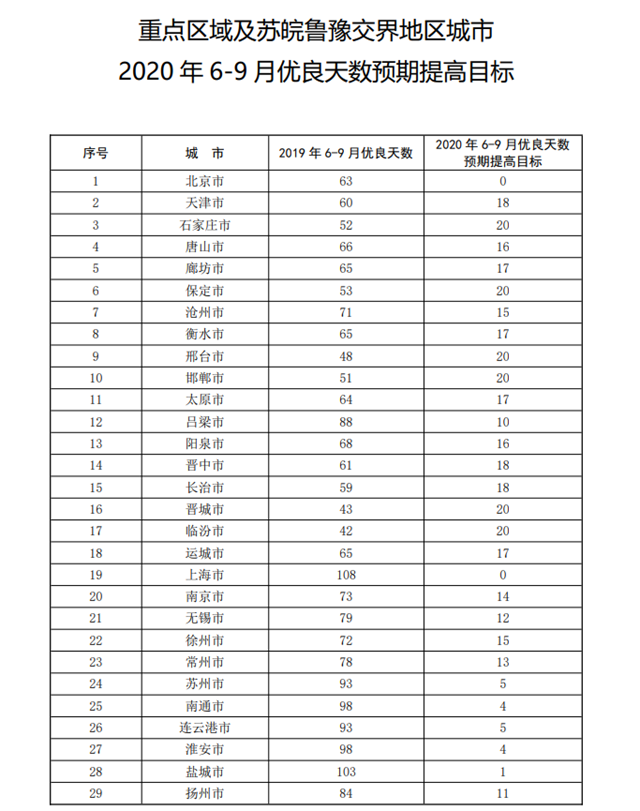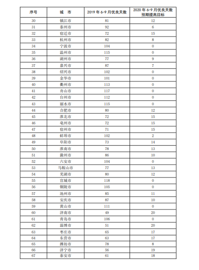 2.重點(diǎn)區(qū)域及蘇皖魯豫交界地區(qū)城市2020年6-9月優(yōu)良天數(shù)預(yù)期提高目標(biāo)