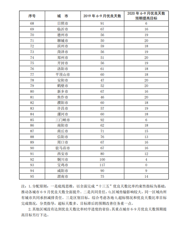 工作目標(biāo):通過攻堅(jiān)行動(dòng),VOCs治理能力顯著提升,VOCs排放量明顯下降,夏季O3污染得到一定程度遏制,重點(diǎn)區(qū)域、蘇皖魯豫交界地區(qū)及其他O3污染防治任務(wù)重的地區(qū)城市6-9月優(yōu)良天數(shù)平均同比增加11天左右(各城市預(yù)期性目標(biāo)詳見附件2),推動(dòng)“十三五”規(guī)劃確定的各省(區(qū)、市)優(yōu)良天數(shù)比率約束性指標(biāo)全面完成(詳見附件3)。