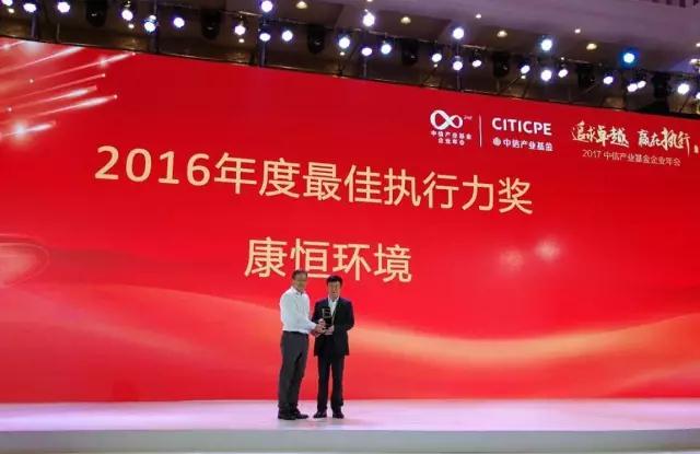 “2017中信產(chǎn)業(yè)基金企業(yè)年會(huì)”在杭州盛大召開,多家中信產(chǎn)業(yè)基金控股企業(yè)參加本屆年會(huì)。在本屆年會(huì)中,康恒環(huán)境斬獲六項(xiàng)獎(jiǎng)項(xiàng)中的三項(xiàng),榮獲中信產(chǎn)業(yè)基金2016年度唯一一家“最有價(jià)值企業(yè)”獎(jiǎng),同時(shí)榮獲“2016年度最佳執(zhí)行力獎(jiǎng)”,康恒環(huán)境董事長(zhǎng)兼CEO龍吉生博士榮獲“2016年度優(yōu)秀CEO獎(jiǎng)"。