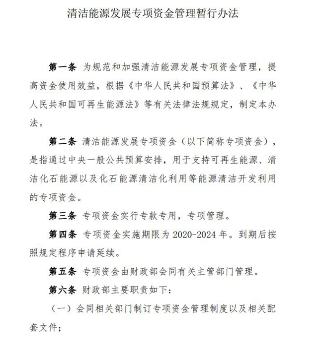 近日,財政部印發(fā)《清潔能源發(fā)展專項資金管理暫行辦法》,其中顯示專項資金實施期限為2020-2024年。