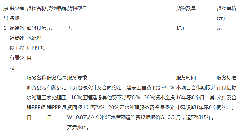 原標(biāo)題:福建仙游污水處理工程PPP項目預(yù)中標(biāo)結(jié)果公告