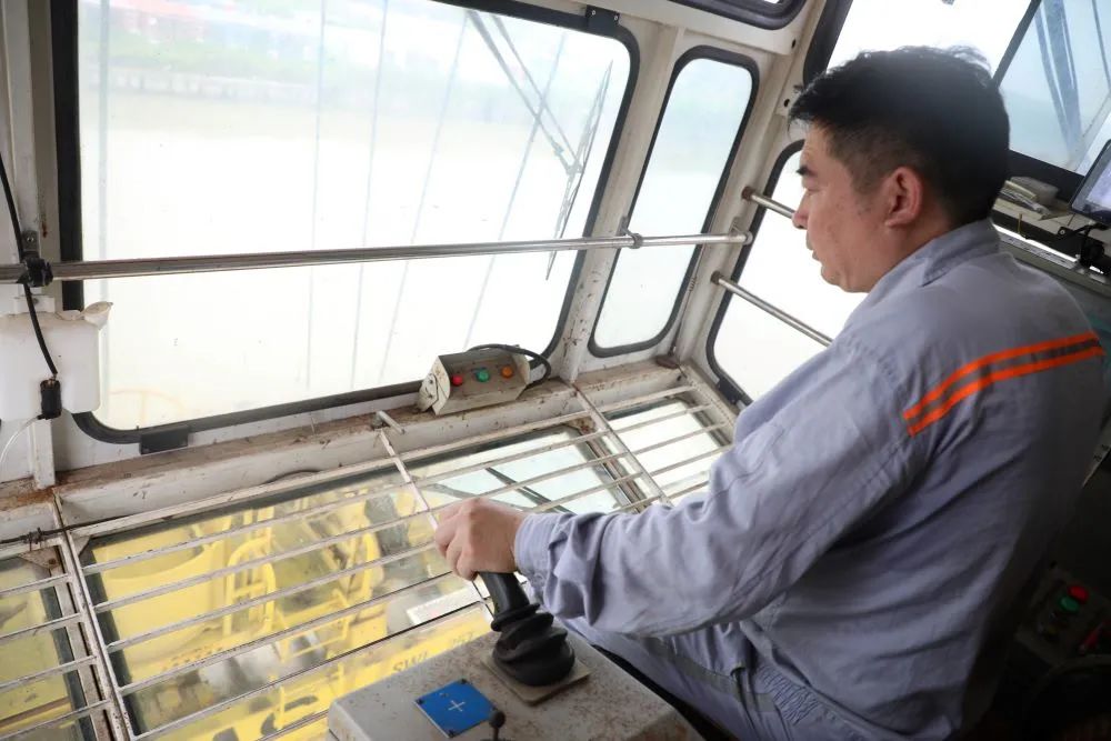 碼頭上,橋吊司機(jī)衛(wèi)益民正在聚精會(huì)神地操作吊裝工作,將集裝箱吊回船上