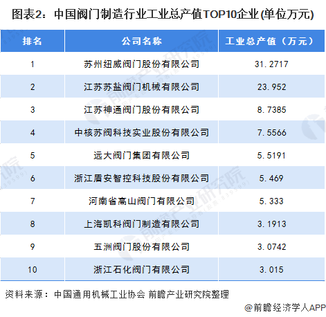 我國(guó)閥門制造行業(yè)工業(yè)總產(chǎn)值排名前十的企業(yè)分別為蘇州紐威閥門股份有限公司、江蘇蘇鹽閥門機(jī)械有限公司、江蘇神通閥門股份有限公司、中核蘇閥科技實(shí)業(yè)股份有限公司、遠(yuǎn)大閥門集團(tuán)有限公司、浙江盾安智控科技股份有限公司、河南省高山閥門有限公司、上海凱科閥門制造有限公司、五洲閥門股份有限公司和浙江石化閥門有限公司。