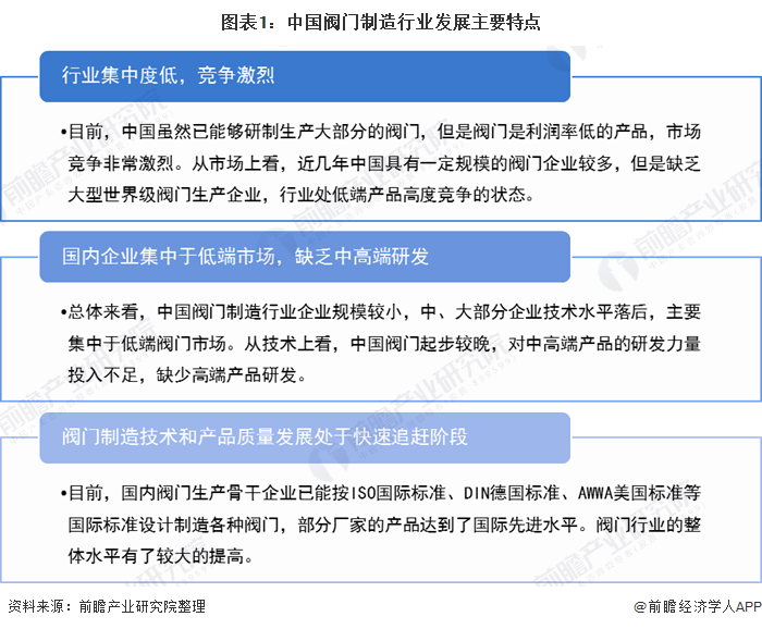 閥門是一種壓力管道元件,它是用來(lái)改變管路斷面和戒指流動(dòng)方向、控制輸送介質(zhì)的壓力、流量、溫度的一種裝置,具有導(dǎo)流、截流、調(diào)節(jié)、防止倒流、分流或溢流卸壓等功能,廣泛應(yīng)用于國(guó)民經(jīng)濟(jì)的各個(gè)主要領(lǐng)域。從我國(guó)閥門制造行業(yè)的發(fā)展特點(diǎn)來(lái)看,我國(guó)閥門制造行業(yè)集中度較低,競(jìng)爭(zhēng)相對(duì)激烈,國(guó)內(nèi)企業(yè)集中于低端市場(chǎng),缺乏中高端研發(fā),閥門制造技術(shù)和產(chǎn)品質(zhì)量發(fā)展處于快速追趕階段。