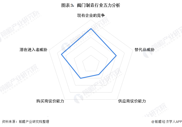 我國(guó)閥門制造行業(yè)對(duì)于上游原材料行業(yè)行業(yè)的議價(jià)能力較弱,國(guó)內(nèi)大量中低端產(chǎn)品處于價(jià)格競(jìng)爭(zhēng)階段,行業(yè)對(duì)下游行業(yè)的議價(jià)能力較弱;隨著外資的不斷進(jìn)入,其在品牌和技術(shù)方面均占優(yōu)勢(shì),外資的進(jìn)入將給國(guó)內(nèi)企業(yè)帶來(lái)巨大的威脅和壓力;閥門是通用機(jī)械的一種,通用機(jī)械產(chǎn)品的特性是通用性強(qiáng)、結(jié)構(gòu)較為簡(jiǎn)單、操作方便,但高新技術(shù)產(chǎn)品具有機(jī)電一體化、高效、節(jié)能、耐腐蝕等特性,一般產(chǎn)品結(jié)構(gòu)簡(jiǎn)單,易于模仿制造,會(huì)造成低水平重復(fù)建設(shè)及市場(chǎng)無(wú)序競(jìng)爭(zhēng),存在一定的替代品威脅。