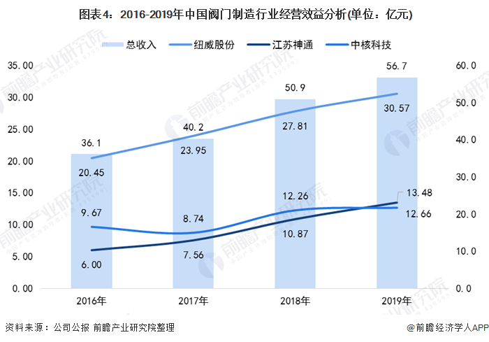 紐威股份、江蘇神通、中核科技等企業(yè)為我國(guó)閥門制造行業(yè)的領(lǐng)先企業(yè)。以紐威股份、江蘇神通、中核科技為例,計(jì)算我國(guó)閥門制造行業(yè)總體經(jīng)營(yíng)效益情況。2016-2019年,我國(guó)閥門制造行業(yè)營(yíng)業(yè)收入逐年提高。2019年,三家企業(yè)營(yíng)業(yè)總收入達(dá)56.7億元,其中,紐威股份營(yíng)收最高,為30.57億元,其次為江蘇神通,營(yíng)業(yè)收入達(dá)13.48億元。綜合來(lái)看,3家企業(yè)經(jīng)營(yíng)效益相對(duì)較好。