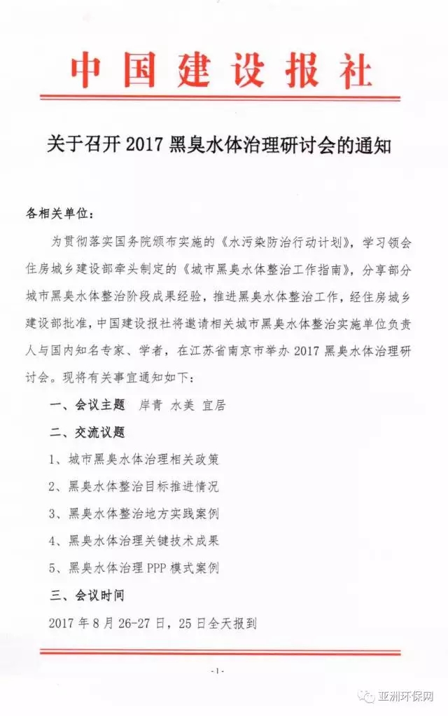 為貫徹落實(shí)國務(wù)院頒布實(shí)施的《水污染防治行動計(jì)劃》,學(xué)習(xí)領(lǐng)會住房城鄉(xiāng)建設(shè)部與環(huán)境保護(hù)部共同制定的《城市黑臭水體整治工作指南》,分享部分地區(qū)城市黑臭水體整治階段成果經(jīng)驗(yàn),推進(jìn)黑臭水體整治工作,為此,經(jīng)住房城鄉(xiāng)建設(shè)部批準(zhǔn),中國建設(shè)報(bào)社主辦,邀請相關(guān)城市黑臭水體整治實(shí)施單位負(fù)責(zé)人與國內(nèi)知名專家、學(xué)者,在江蘇省南京市舉辦2017黑臭水體治理研討會?,F(xiàn)將有關(guān)事宜函告如下: