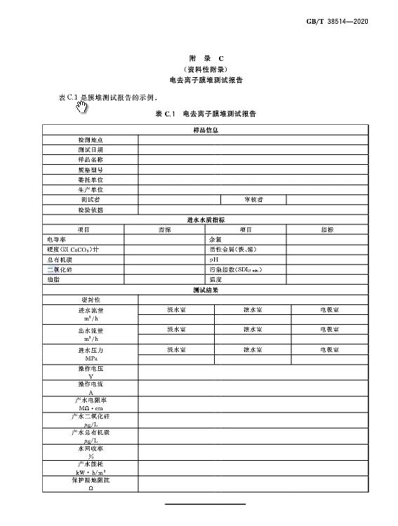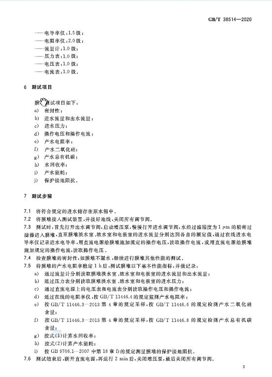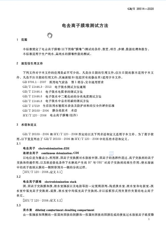 《電去離子膜堆測試方法》GB/T 38514-2020于近日發(fā)布,2021年2月1日起施行。