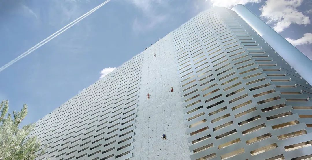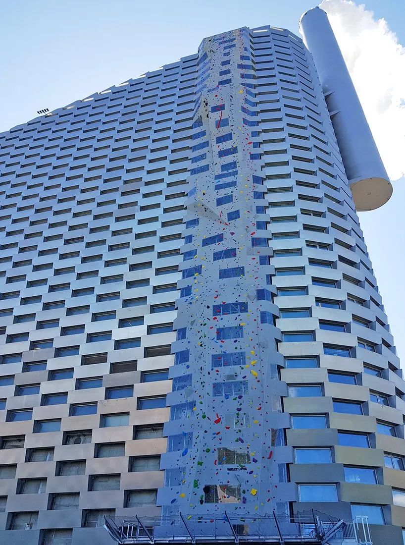 位于建筑的一側(cè),還有一個高 85m、寬 10m 的攀巖墻,它成功打破世界紀錄,成為最高的人工攀巖墻。它的設(shè)計類似于天然的山墻,用各種難度滿足不同程度攀巖者的需求。