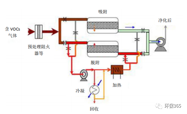 采用活性炭作為吸附劑,采用惰性氣體循環(huán)加熱脫附分流冷凝回收的工藝對(duì)有機(jī)氣體進(jìn)行凈化和回收?;厥找和ㄟ^后續(xù)的精制工藝可實(shí)現(xiàn)有機(jī)物的循環(huán)利用。工藝原理示意圖如下: