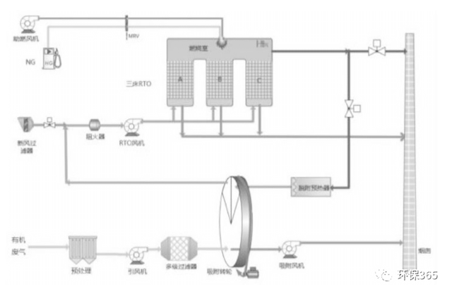 沸石轉(zhuǎn)輪吸附濃縮+蓄熱式燃燒工藝流程示意圖