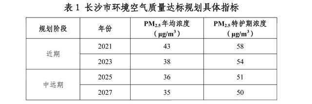 規(guī)劃目標(biāo):長(zhǎng)沙市PM2.5年均濃度在2027年達(dá)標(biāo)。近期規(guī)劃到2023年,PM2.5平均濃度有效降低,力爭(zhēng)臭氧年均濃度升高趨勢(shì)基本得到遏制,中遠(yuǎn)期規(guī)劃到2027年,實(shí)現(xiàn)PM2.5年均濃度達(dá)標(biāo),臭氧超標(biāo)風(fēng)險(xiǎn)顯著降低。具體分階段指標(biāo)如下: